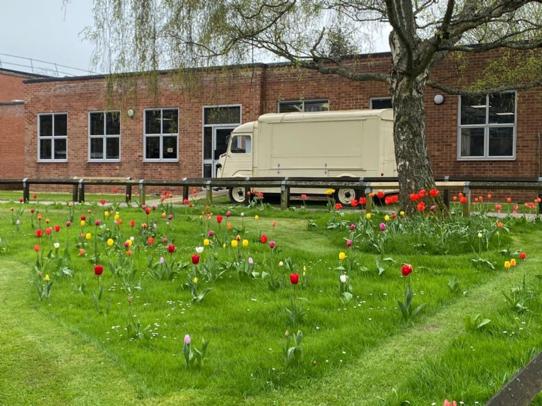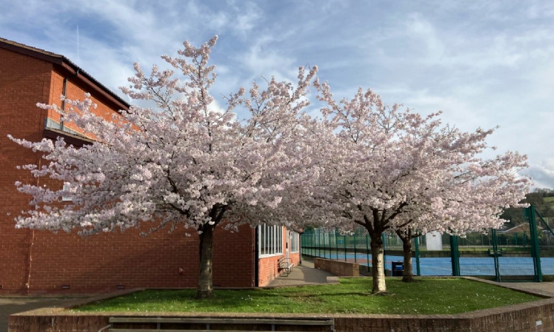 The photo below shows the tulips in the quad alongside our new catering unit. The photograph above shows the beautiful blossom trees by Individual Learning.