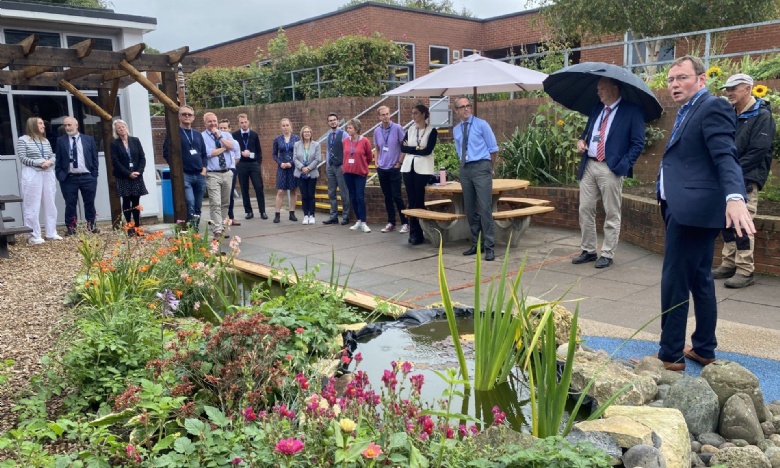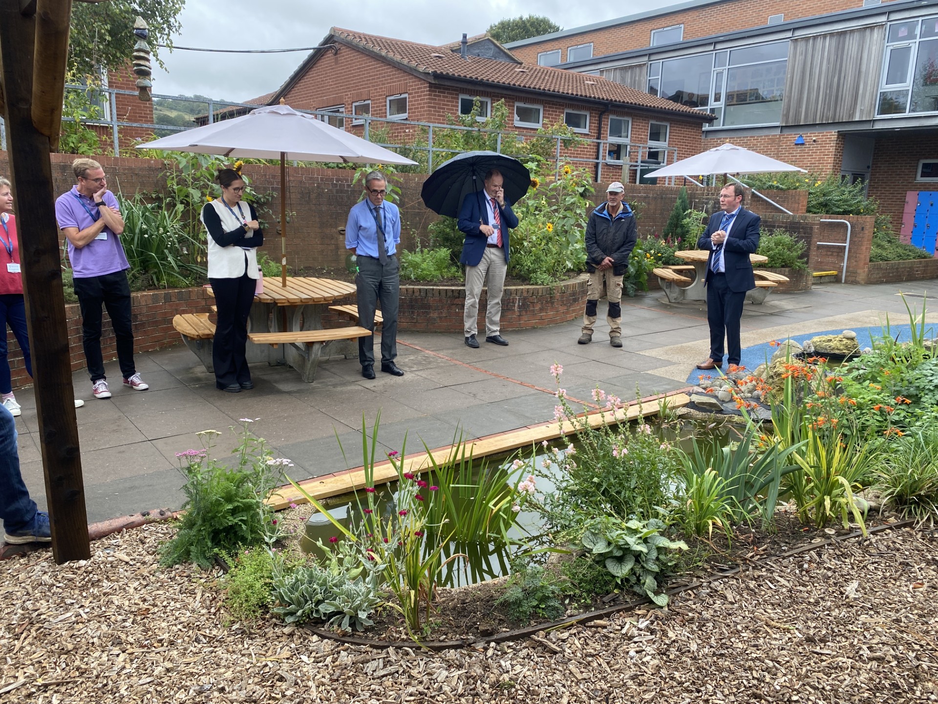 Yesterday saw the unveiling of a much improved green space around the school grounds. A new seating area with ponds, waterfall, planting area, veg garden and gazebo was opened by the headmaster and the governors of the school.