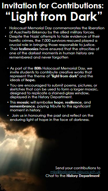 The history department are running a competition. This is in line with this year's Holocaust Educational Trust theme, "Light through Dark", they will create a display to commemorate Holocaust Memorial Day. Students can to contribute creative work exploring this theme. Poems, artwork, and other creative outcomes are all welcome and will form part of our display concept.