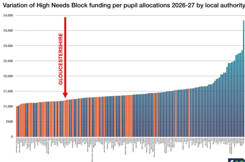 The funding for High Needs Education is equally unfair. Gloucestershire receives £1197.78 per pupil and is the 33rd worst funded authority in the country. The best funded, Camden receives £3831.71 per pupil. I don’t want to sound like I’ve got a problem with County Durham but again noticed that they get £1660.47 per pupil.