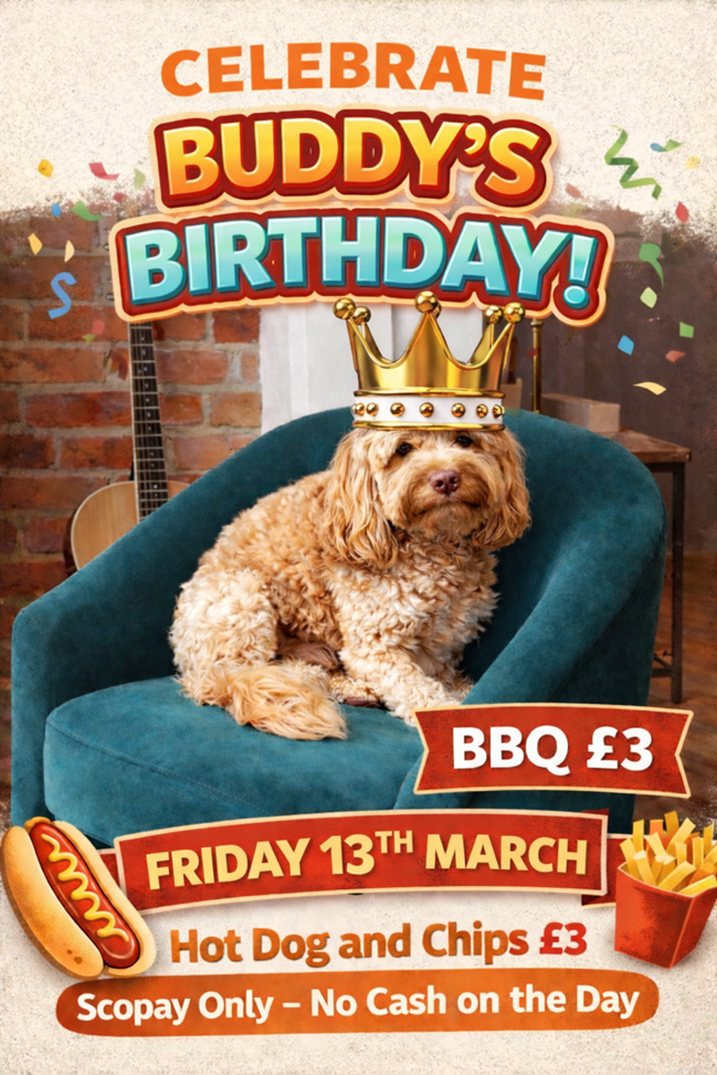 It's Buddy's 3rd Birthday on Friday 13th March and we are celebrating with Hot Dogs!