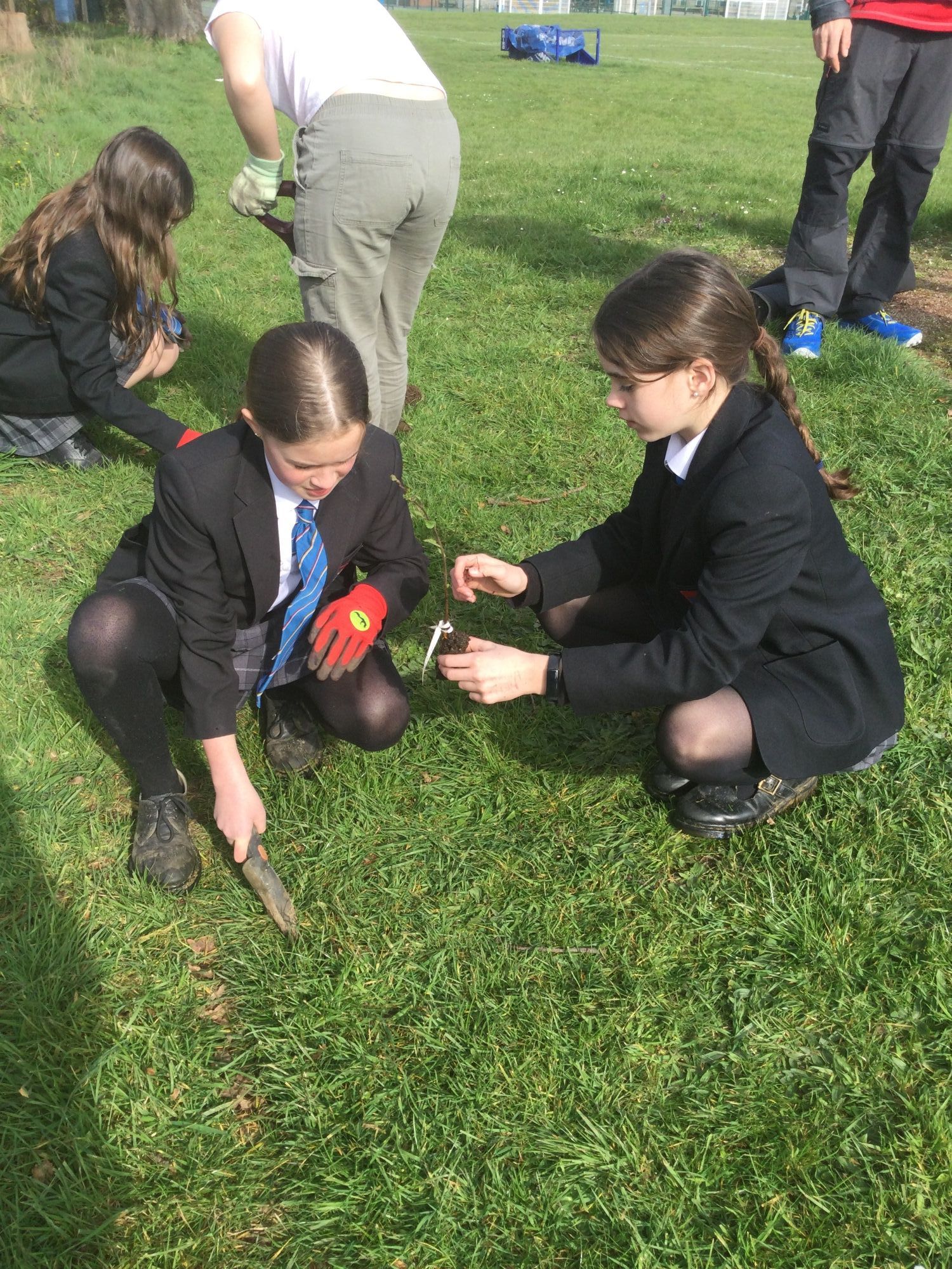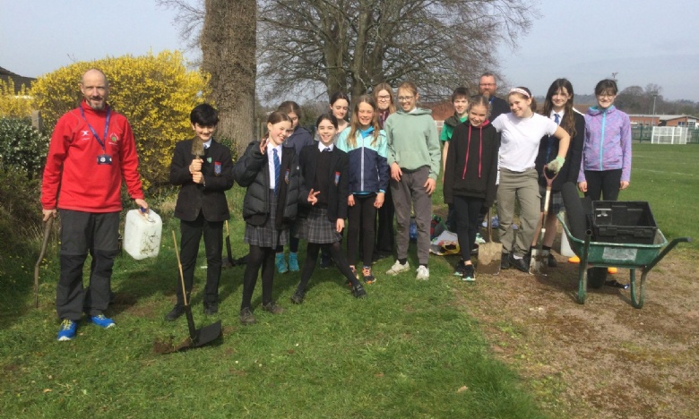 The Schools Eco group have been planting trees on the school grounds. The trees were donated by the Woodland trust, and were a range of British native deciduous trees. The aim of putting them in was to encourage biodiversity and to help absorb CO2 as they grow.