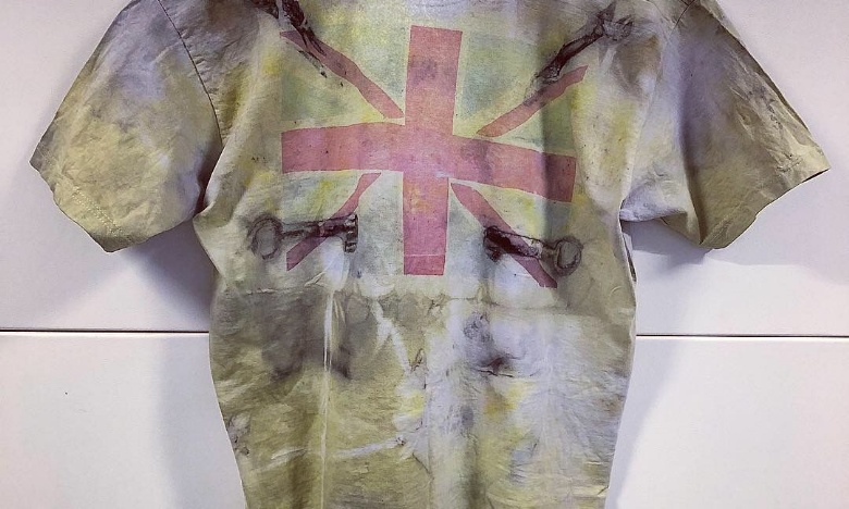 The t shirt has been made from scratch by a year 9 boy and was dyed in the same way as the bags and dress he also painted his own union jack flag which was then also printed onto his top.