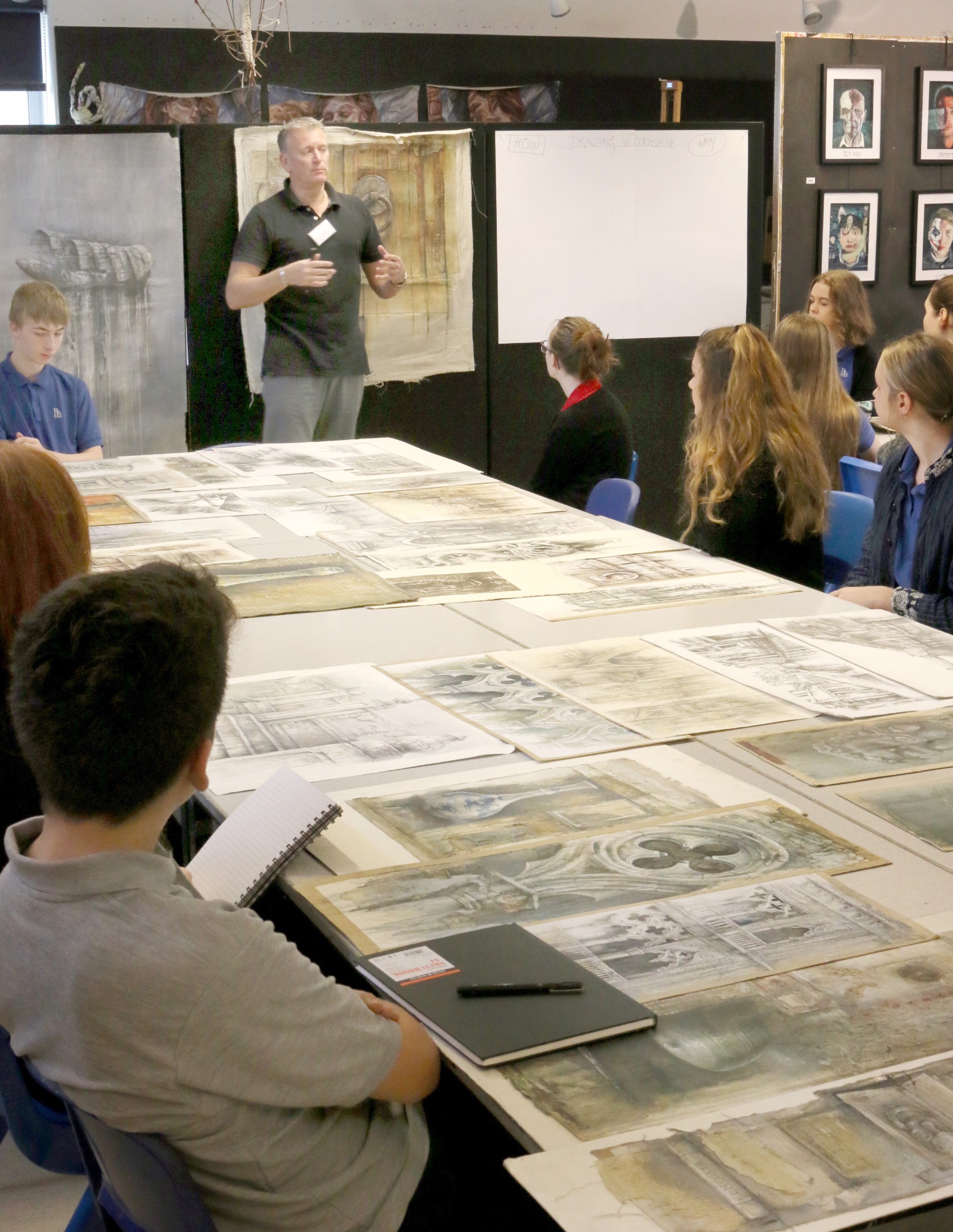 Students were taught about a range of his techniques on the day. He certainly packed their time with high energy and exciting tasks! They learnt about creating surfaces to draw onto, how to select the right composition and how to consider their use of tone when making purposeful decisions about their work. For some the fast pace of the day was challenging, however, by the end of the day all found it hugely rewarding and were thrilled with the outcome of their work. This was certainly a memorable day for students and teachers alike.