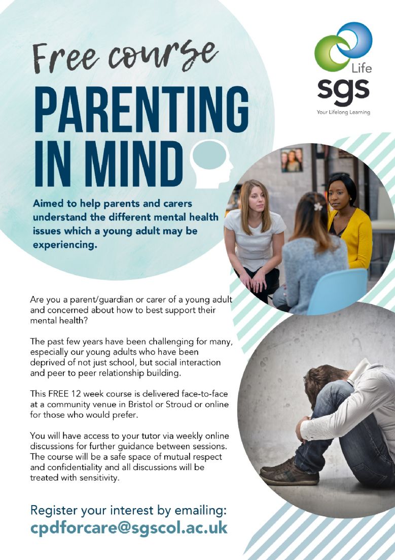 SGS College is offering a free 12-week course to support parents of teenagers and young adults. We will help you navigate through the issues and mental health concerns that many of our young people are now facing. Taught in a fun and interactive way, you will also learn some tips on how to look after your own wellbeing. Sessions are either face-to-face in Bristol or Stroud or online. On completion of the course you may go on to study in more depth (SGS trains adults to become professional therapeutic counsellors - see www.sgscol.ac.uk/study/counselling) or simply take the tools you have learned and use them to support your family and friends.