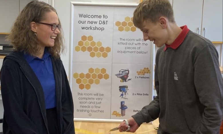 To cope with such strong numbers at GCSE and A-level the school has invested in a brand new DT lab. We had a lovely opening ceremony and in a first for the school we chose two students to perform the official opening duties. Eleanor Quick (who last year won the prestigious Arkwright Scholarship) and Matthew Chestney had the honour of cutting the ribbon after a short speech from Mr Burke.