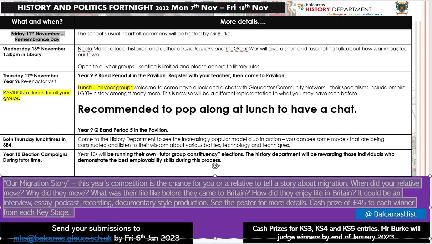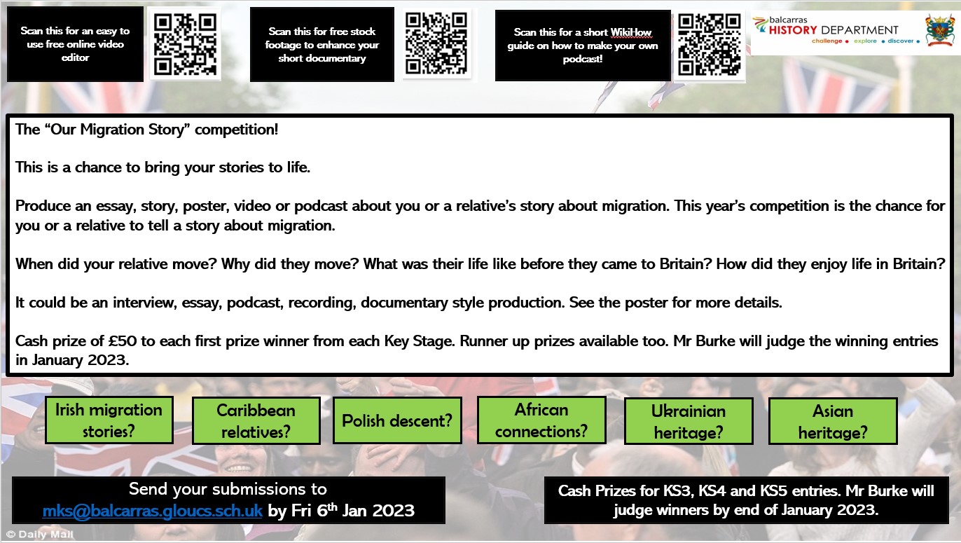 “Our Migration Story” – this year’s competition is the chance for you or a relative to tell a story about migration. When did your relative move? Why did they move? What was their life like before they came to Britain? How did they enjoy life in Britain? It could be an interview, essay, podcast, recording, documentary style production. See the poster for more details. Cash prize of £45 to each winner from each Key Stage.