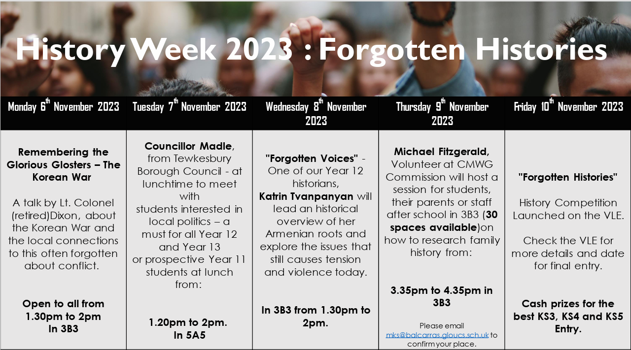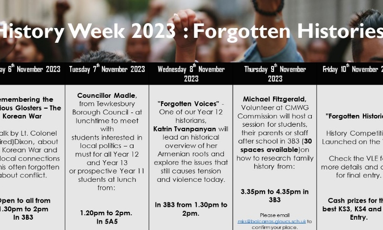 To mark History week Balcarras are having a 'Forgotten Histories' week at the start of November