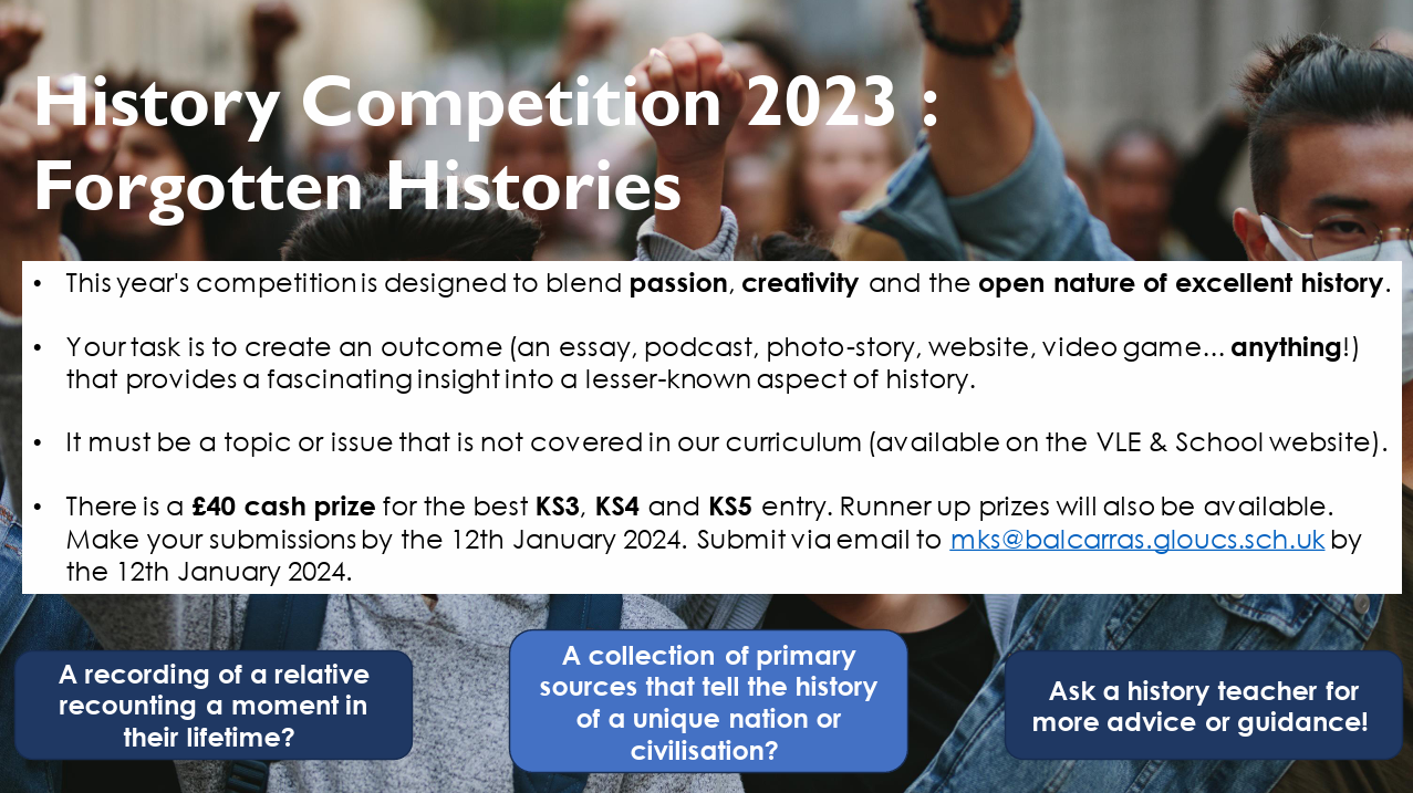 - Family History Workshop: Don't miss our after-school family history workshop. To reserve your spot, please email mks@balcarras.gloucs.sch.uk.