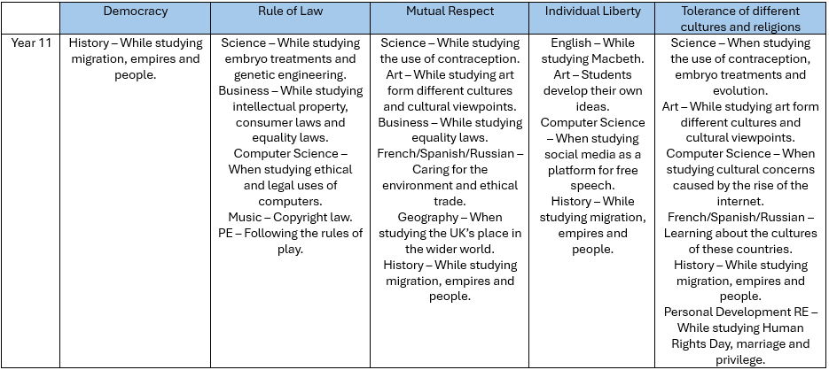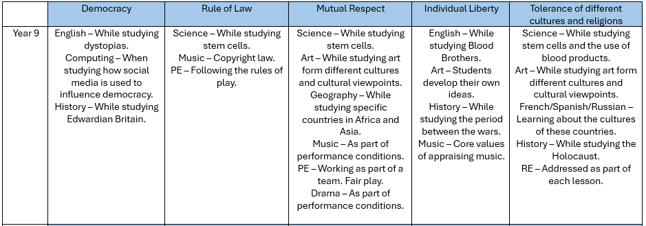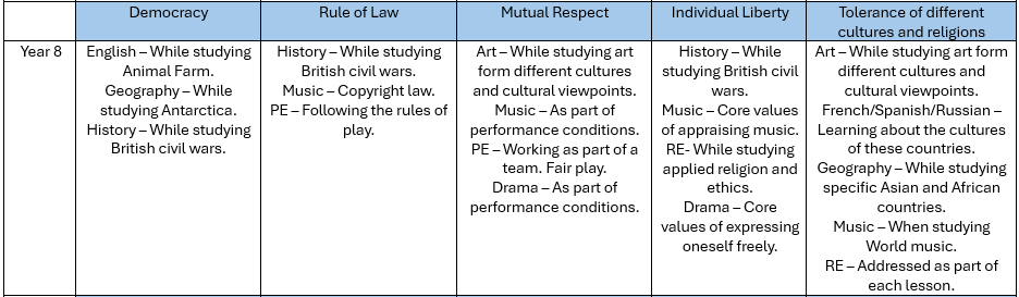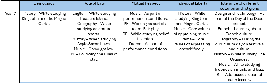 In addition, our curriculum is full of opportunities to explore British values with our pupils. Below is a snapshot showing some of the areas that will be looked at each year.