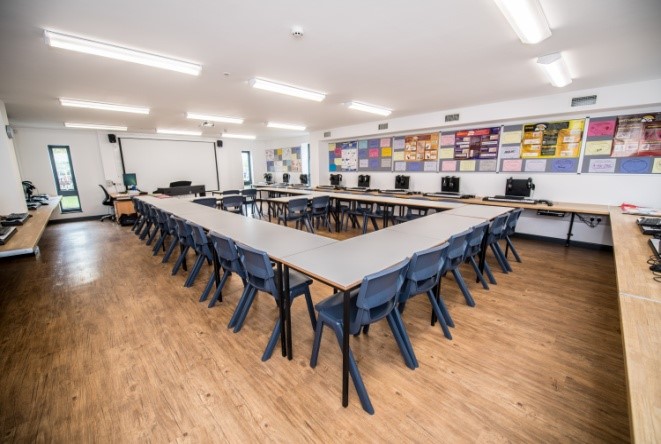 We have two main teaching classrooms and an additional classroom for ensemble and instrumental tuition. The upstairs classroom is used as a performance space, where practical assessments take place and the downstairs classroom houses a suite of 18 student PCs running Sibelius, Musescore and Mixcraft software. Within the department we have 8 practice rooms attached and students can access these for lunch time rehearsals. We foster a lively, collaborative and informative environment where the students can engage fully and creatively in the power of music.
