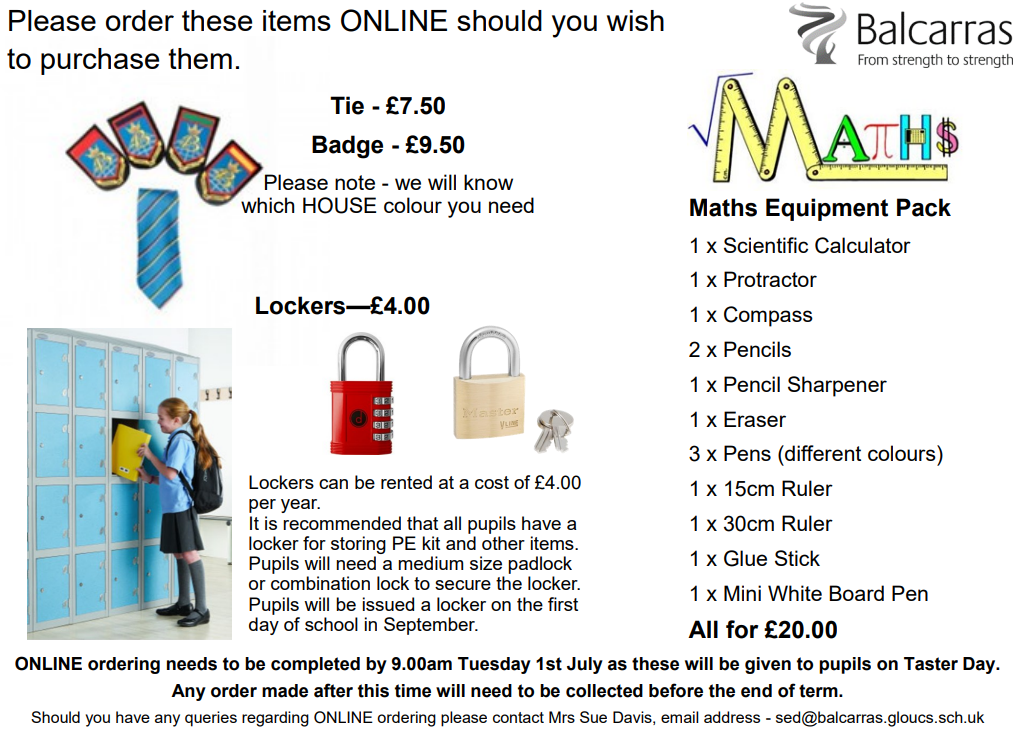 Should you have any queries regarding ONLINE ordering please contact Mrs Sue Davis